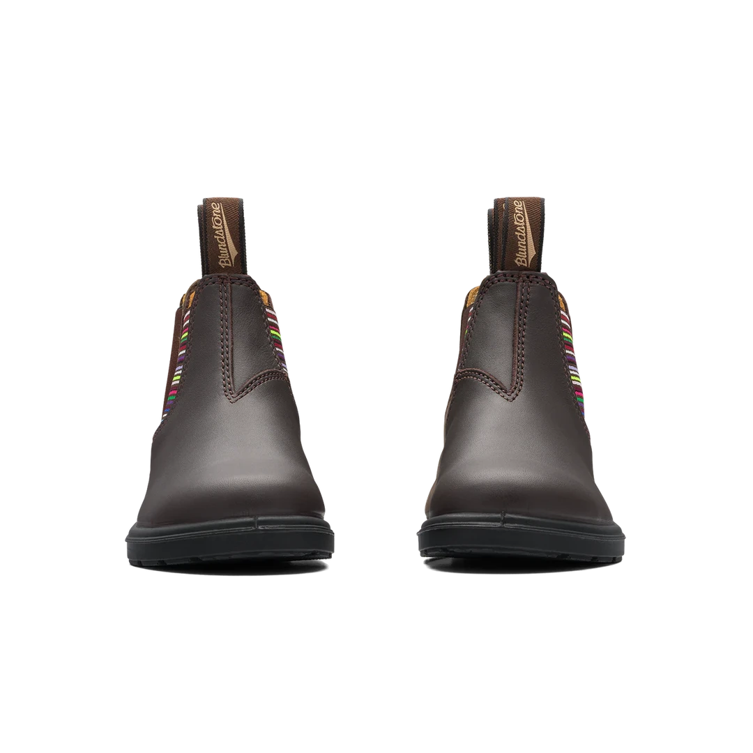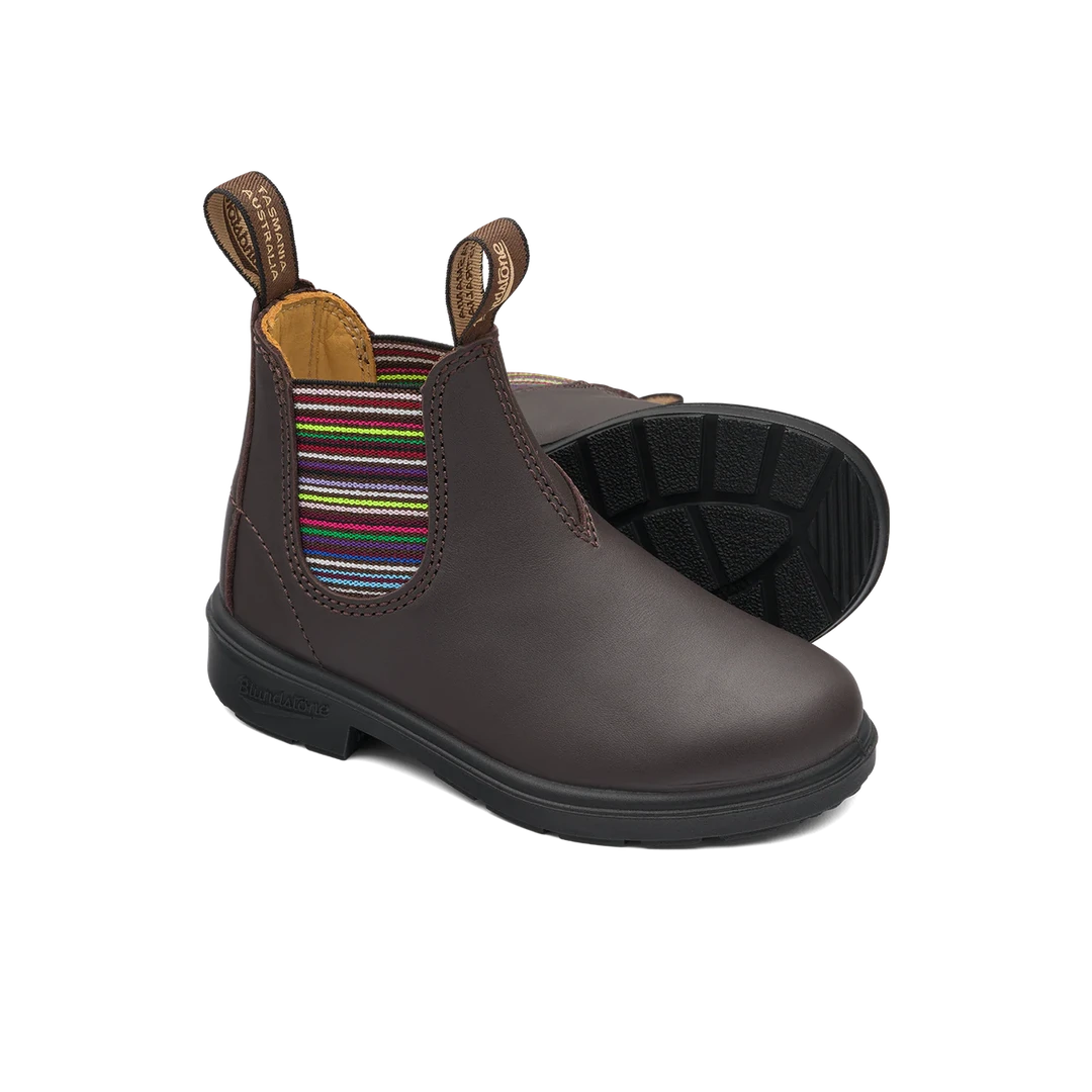 Blundstone 1413 Kids Chelsea in Brown with Striped Elastic is colourful fun and Blundstone comfort for little feet. No-lace freedom gives kids footwear independence. Moms, dads, and teachers, too. Removable insoles for months more wear.