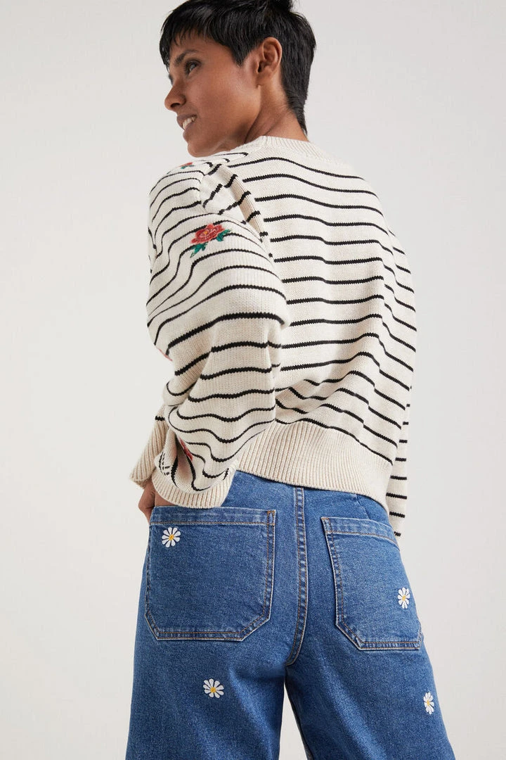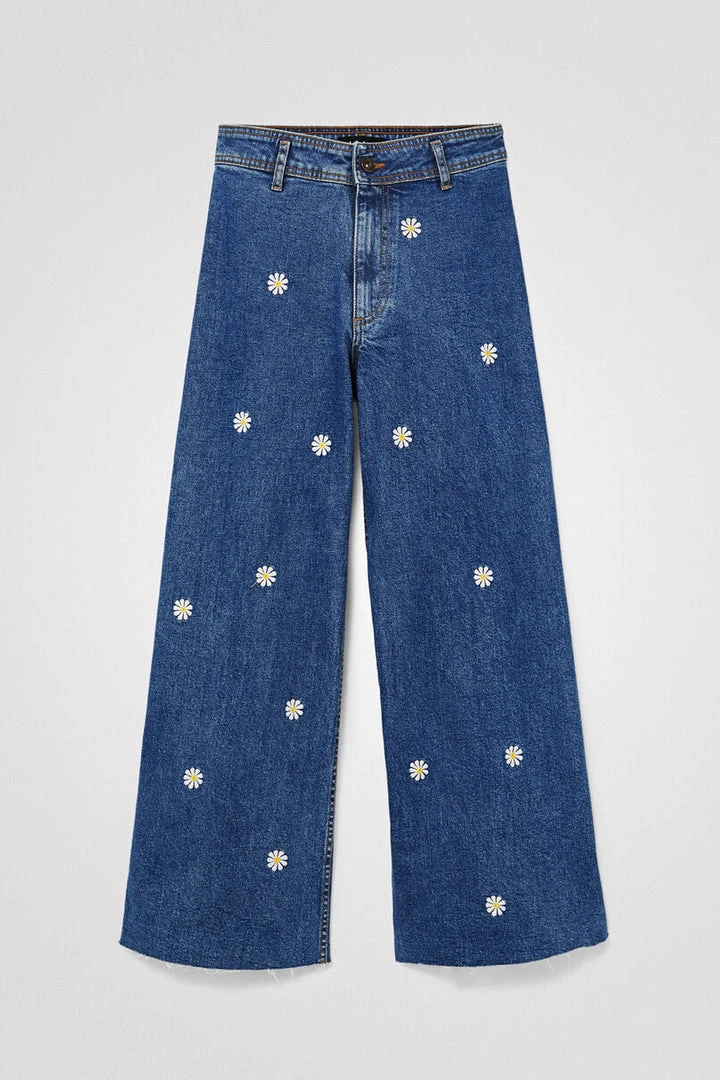These denim culottes covered in embroidered white daisies are gently elasticated so they fit you like a glove. High-waisted with raw-cut hems and made from sustainable cotton.