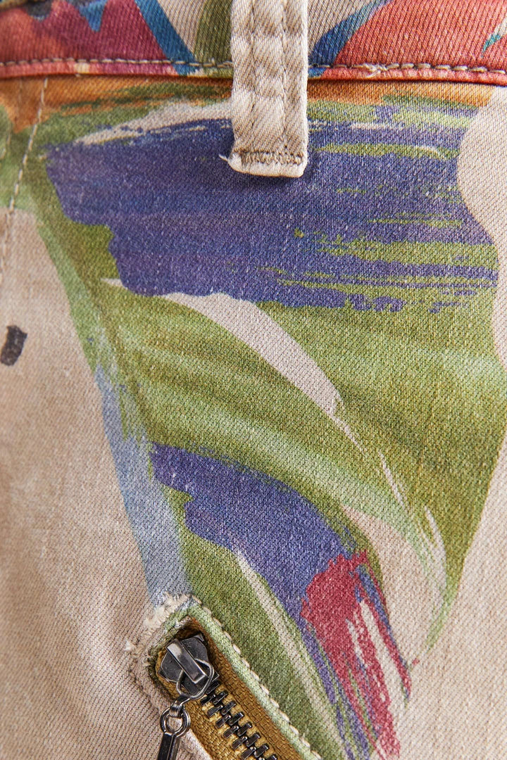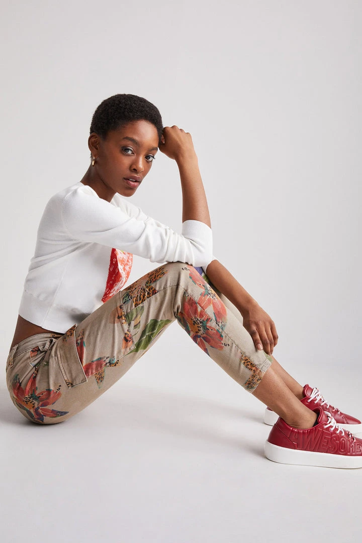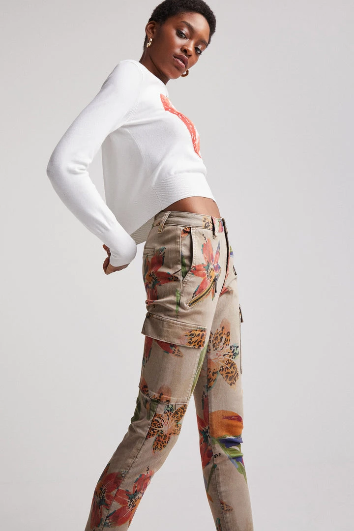 Khaki overdyeing featuring a camoflower print and large side pockets. Very comfortable skinny cargo trousers. Made from sustainable cotton.