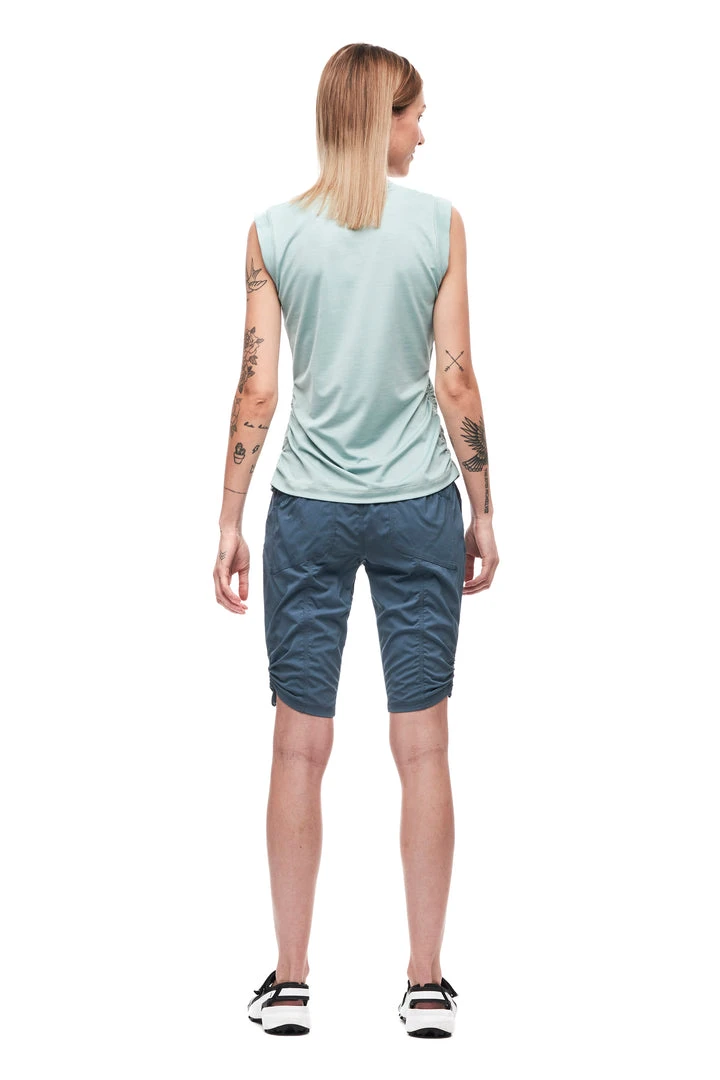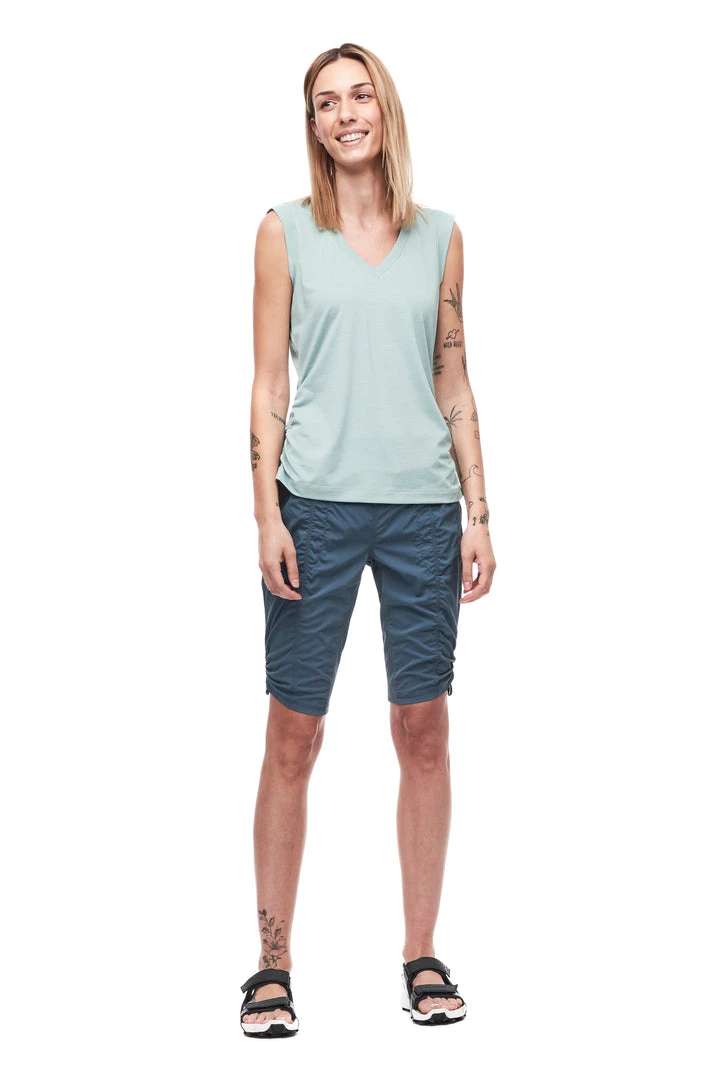 The DIPORTO t-shirt is made of Quick Dry Knit, a light mesh fabric with a Polygiene® finish. Polygiene permanent odor control stops growth of odor-causing bacteria on fabrics, so you can wear more and wash less. You can also have the possibiliy to tie a knot at front of the top which can give you a more fashionable look while remaining useful for your outdoor activities. These features make this top versatile, great for travel and various outdoor activities.