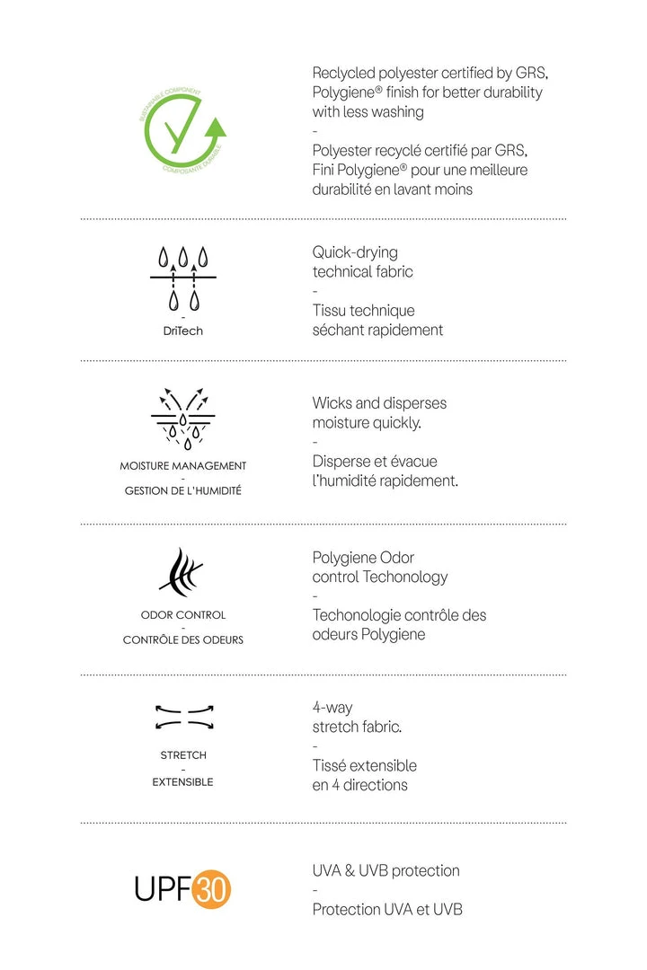 Fabric : 93% Recycled Polyester, 7% Spandex , 165g/m2, Polygiene® Finish, GRS Approved