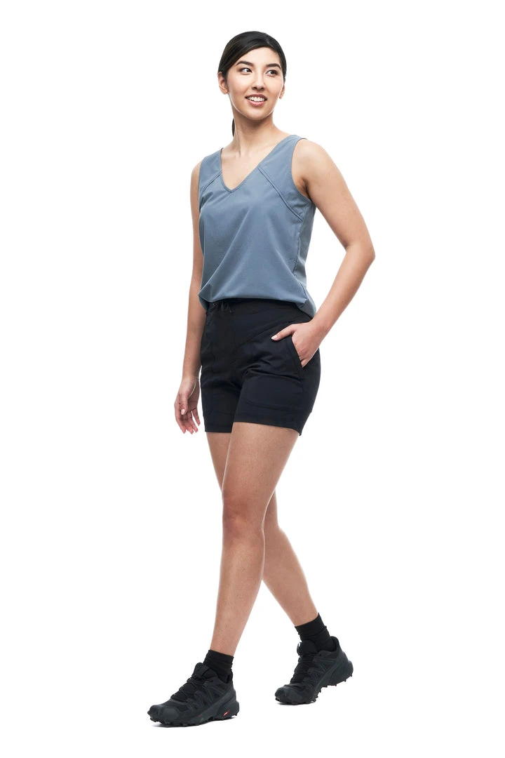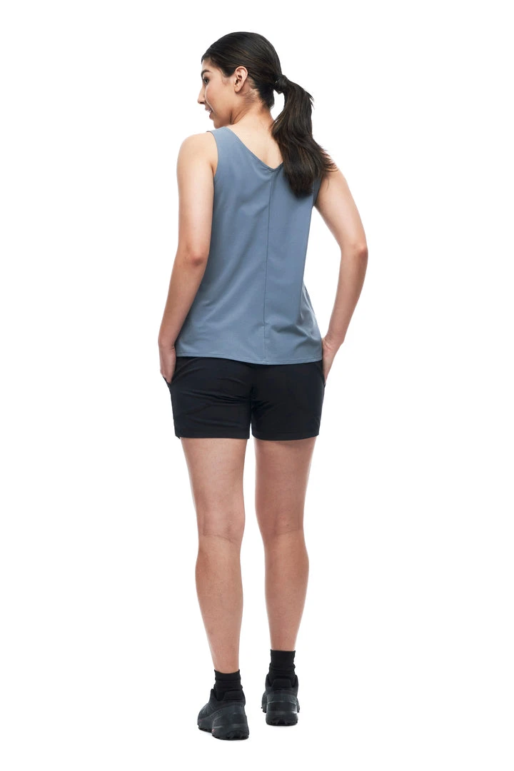 The HALKA ll sleeveless shirt is made of light woven fabric that offers comfort, lightness, softness and stretchability. The fabric dries quickly, has moisture wicking properties and has a UPF rating 30+. These features make this top versatile, great for travel and various outdoor activities.
