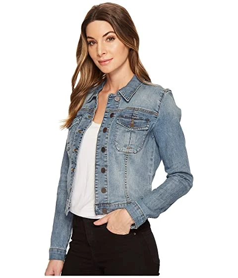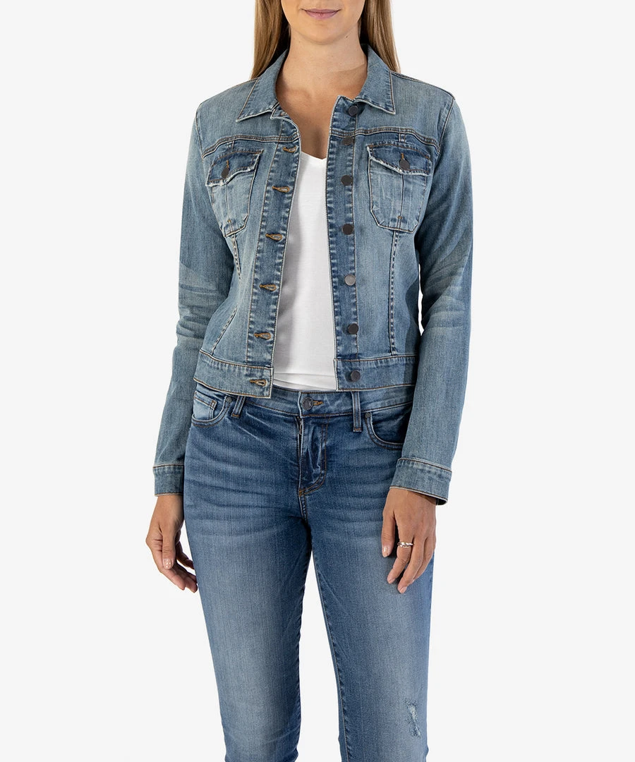 This lightweight denim topper can be paired with any look. Easily dressed up or down, this jacket is made of cotton with a hint of spandex, making it extremely comfortable.