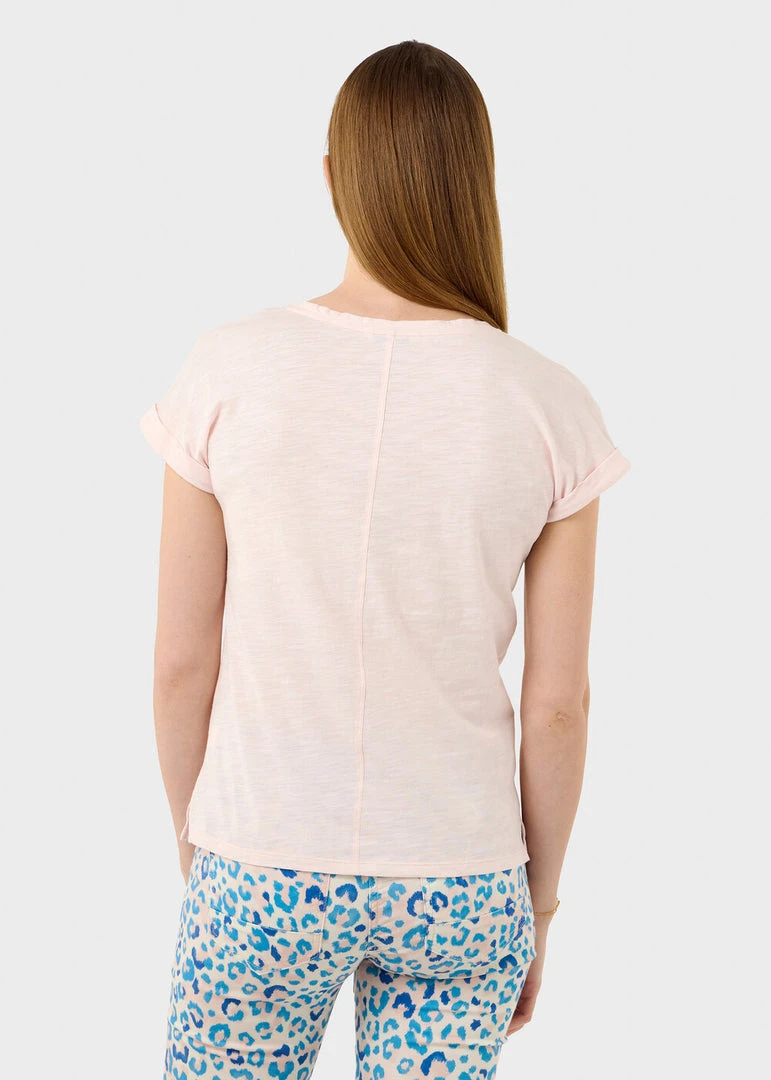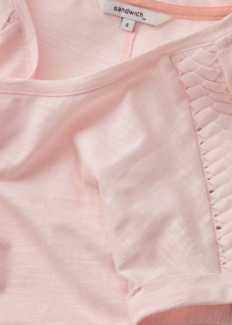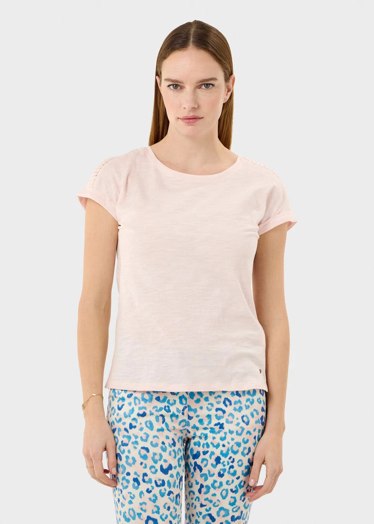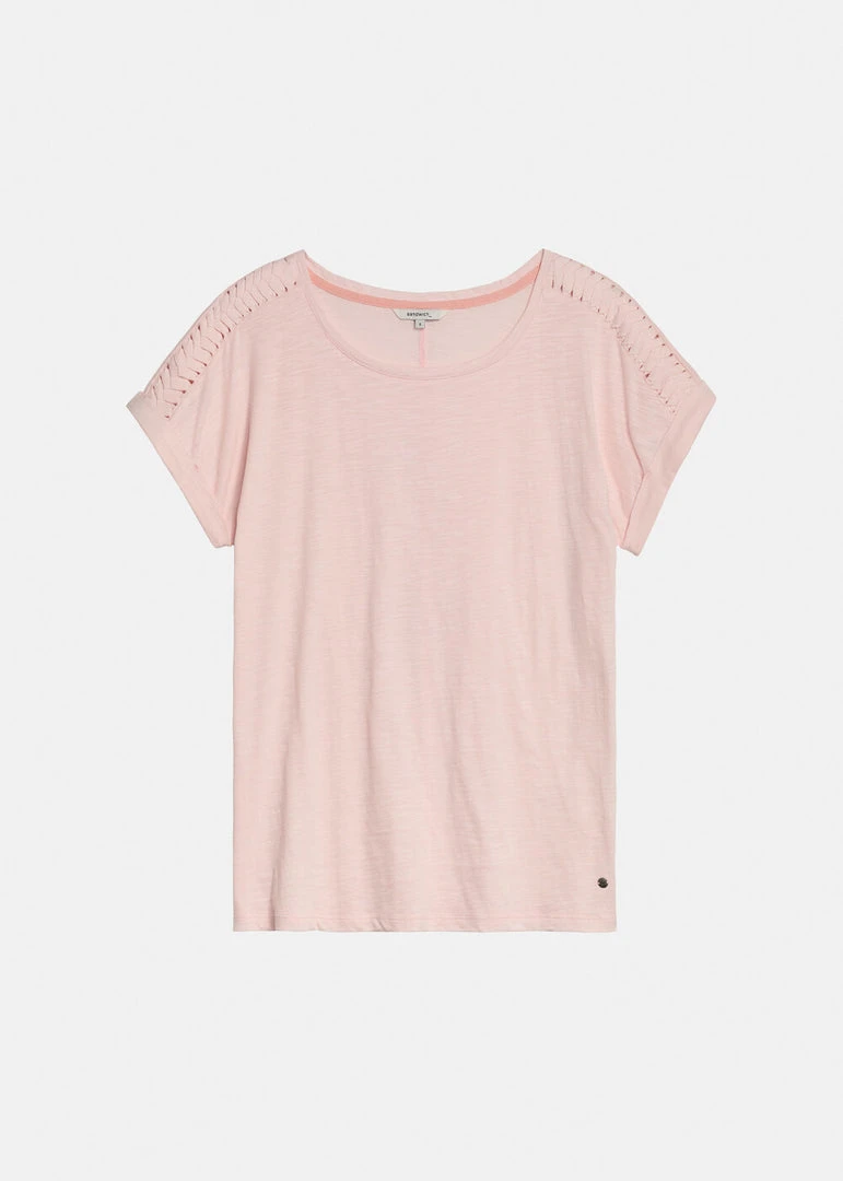 T-shirt with a braided detail on the sleeve. The top has short sleeves that are turned up, a round neckline, and a straight fit. Pair this T-shirt with trendy trousers with print.