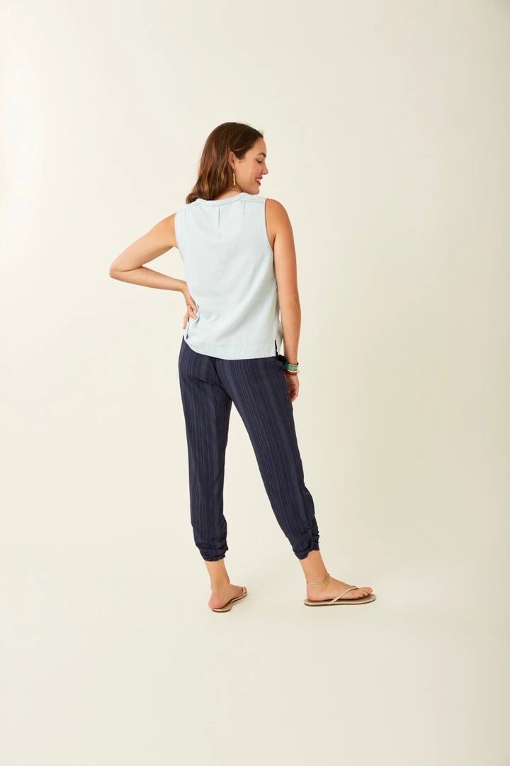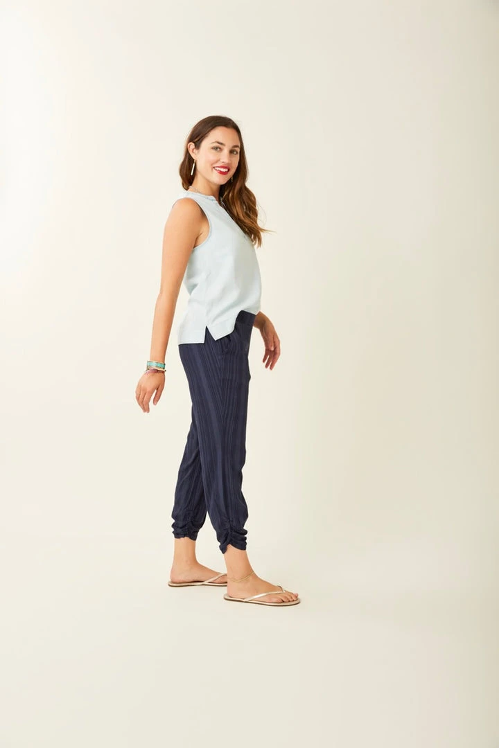 A classic beach pant to wear over a bathing suit or around a bonfire. These pants are made of a silky material and are also designed to be dressed up with a nice top and sandals. Ruched leg opening at bottom are a cute and flattering detail.