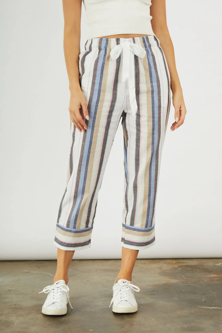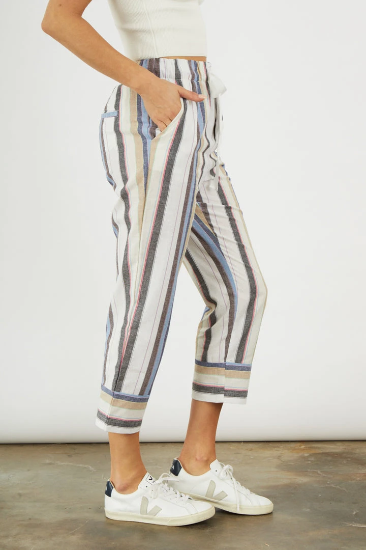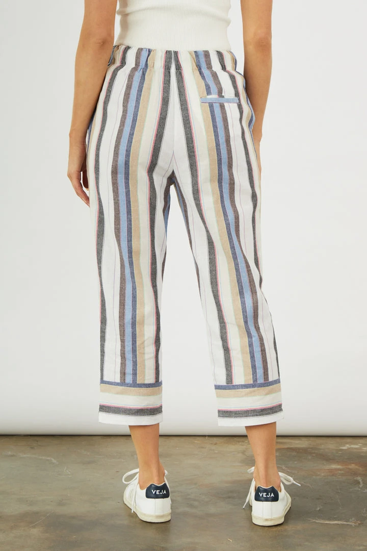 Comfy and relaxed crop pant from Zaket & Plover is in natural toned stripes with horizontal striped cuffs, front pockets and an elasticized pull-on waist with a drawstring.